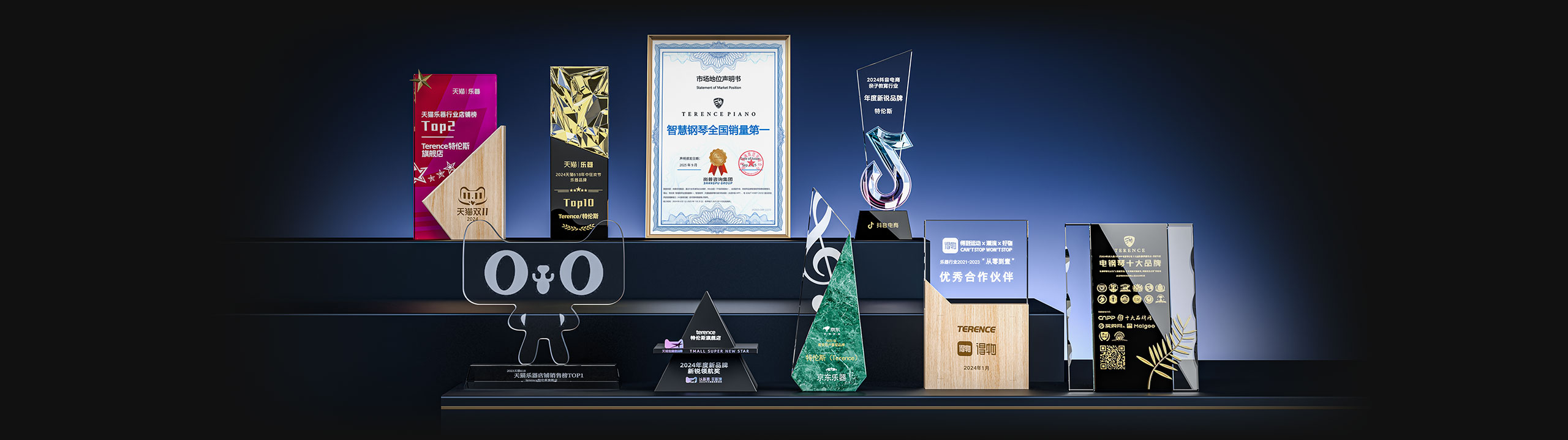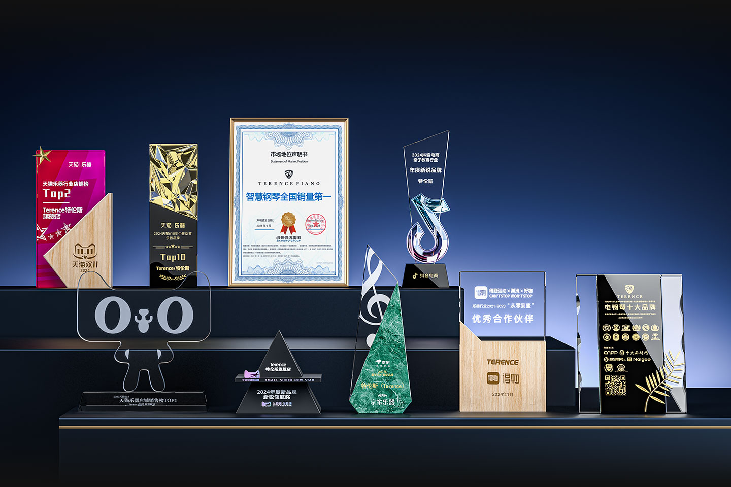 特倫斯創(chuàng)新科技榮獲:智慧鋼琴全國銷量第一[1]、2022年天貓樂器行業(yè)TOP1、2023年天貓618樂器行業(yè)TOP1、2024抖音電商年度新銳品牌、2024天貓樂器店鋪TOP2、2024天貓年度新品牌新銳領(lǐng)航獎、2023年京東最受用戶喜愛品牌等獎項;